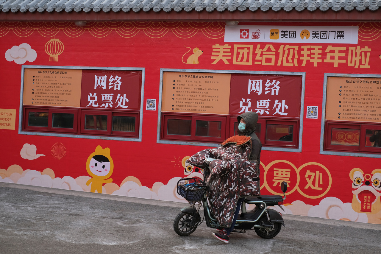 A man rides on his scooter in front of a closed ticket office for internet bookings after the temple fair for the Chinese Lunar New Year in Ditan Park was canceled in Beijing, China on Jan 24, 2020.