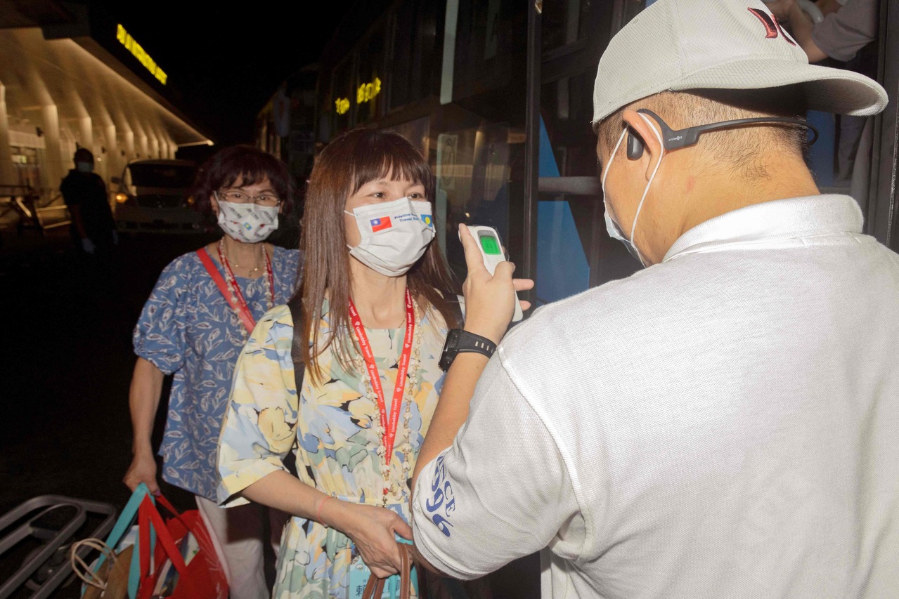 In this photo taken on April 1, 2021, tourists from Taiwan get their temperature taken following their arrival in Koror, Palau.