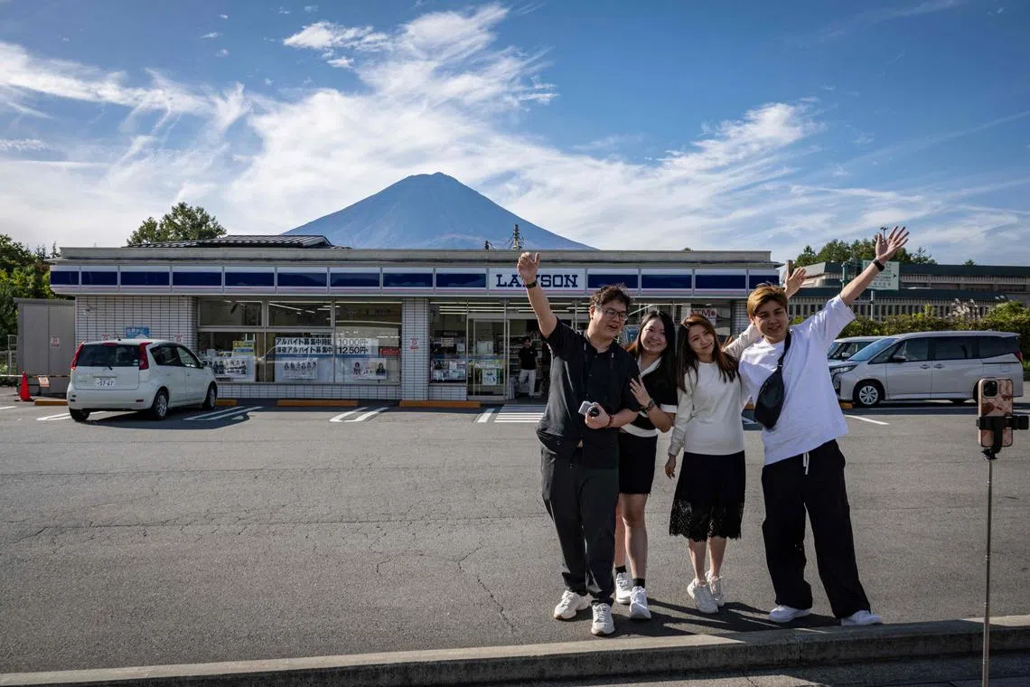 A convenience store has installed barriers to prevent visitors snapping selfies with Mount Fuji in the background from getting injured on the road.