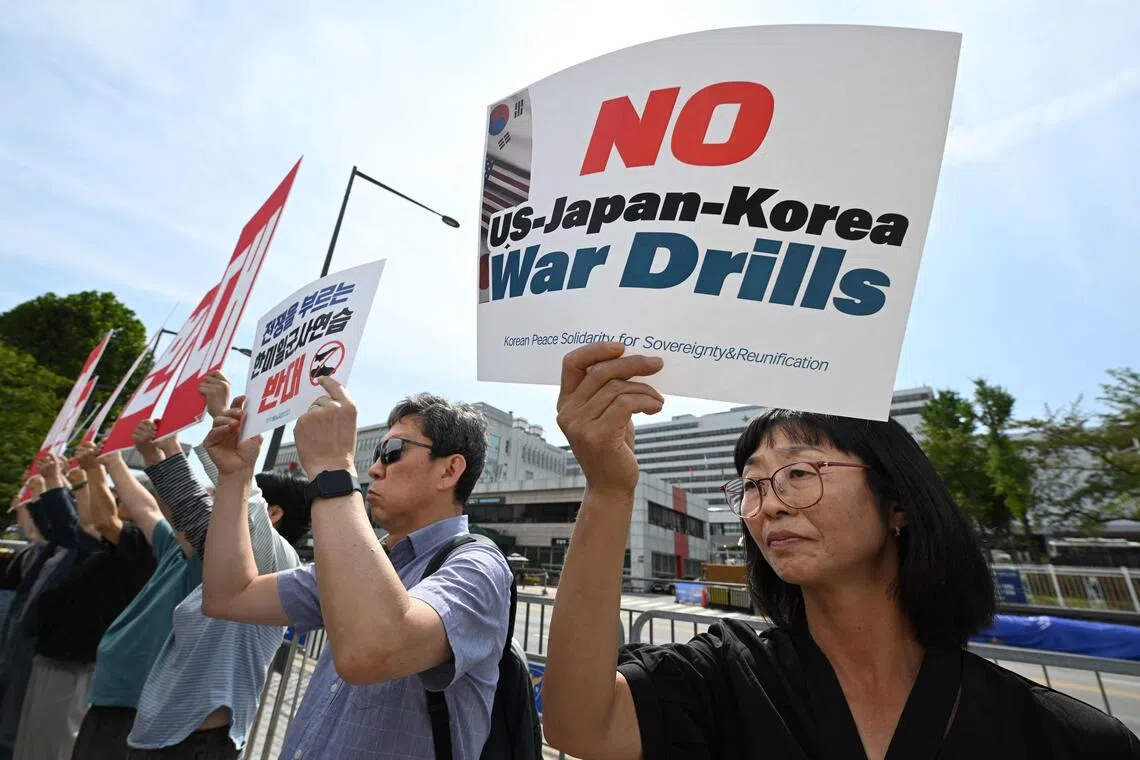 Anti-war activists in South Korea protest against a joint military exercise by South Korea, the US and Japan.