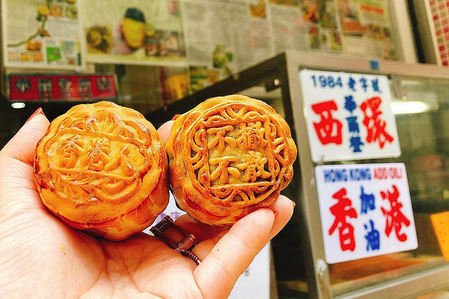 Mooncakes from the Wah Yee Tang Cake Shop that read "Hong Kongers" (left) and "No withdrawal, no dispersal".