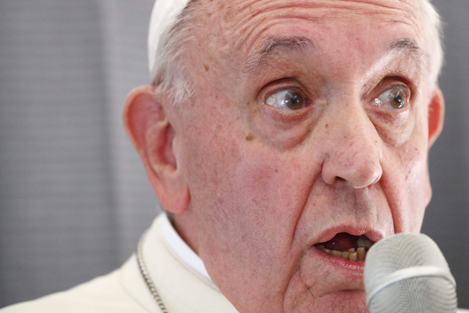 Pope Francis addressing the media on board his papal plane.