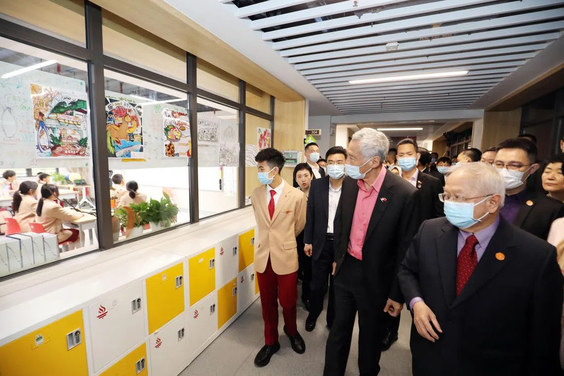 PM Lee Hsien Loong (second right) visiting the Sin Chin Academy in the Guangzhou Knowledge City on March 28, 2023.