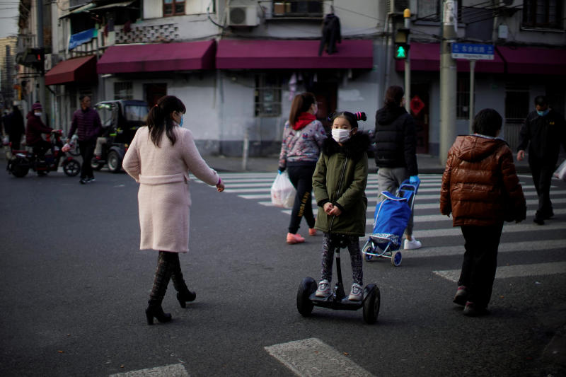 A girl wearing a mask rides a smart self-balancing scooter on a street in downtown Shanghai, China, on Feb 23, 2020.