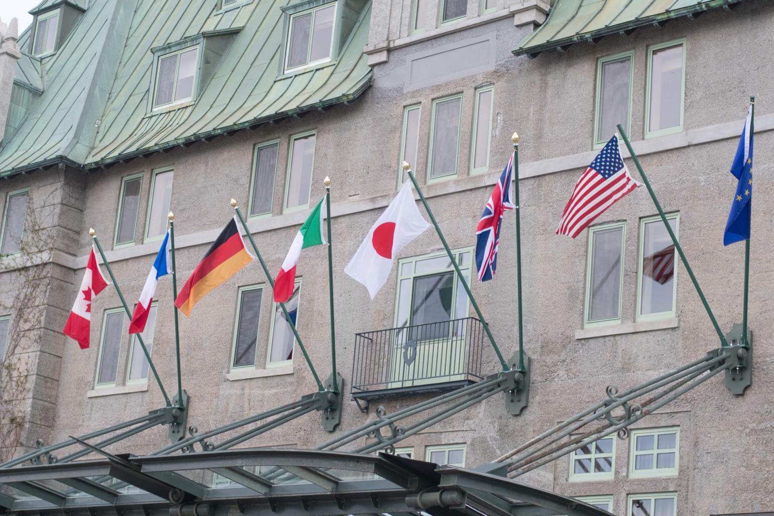 Flags fly over the Fairmont Le Manoir Richelie hotel, the location for the G7 summit, in La Malbaie, Quebec.