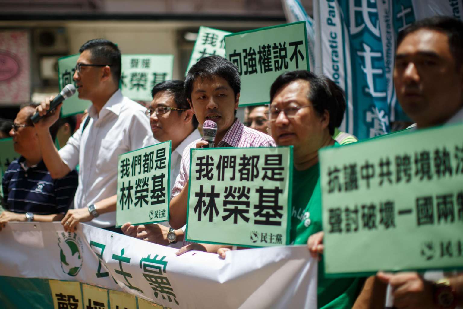 Democratic Party members holding up placards on their way to protest at the Chinese Liaison Office in Hong Kong on June 17.