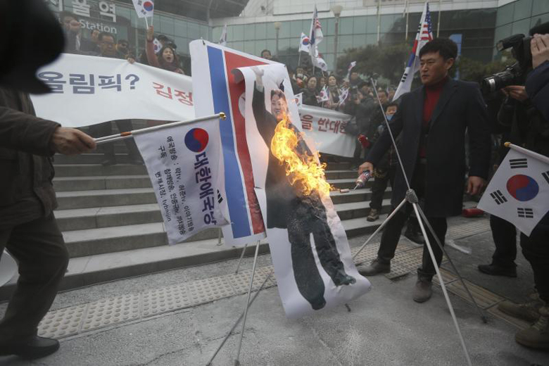 Protesters burn an image of North Korean leader Kim Jong Un during a rally against North Korea's participation to the Pyeongchang Winter Olympics in Seoul on Jan 22.