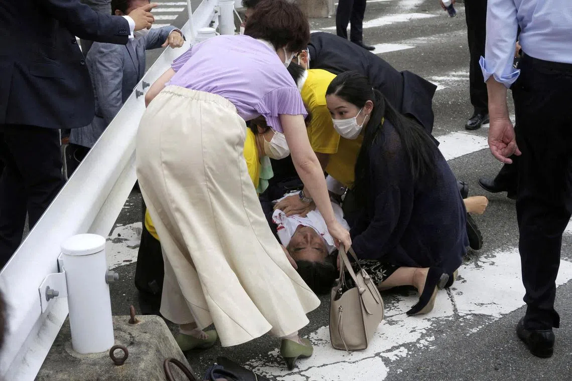Former Japanese prime minister Shinzo Abe lies on the ground after being shot during an election rally in July 2022.