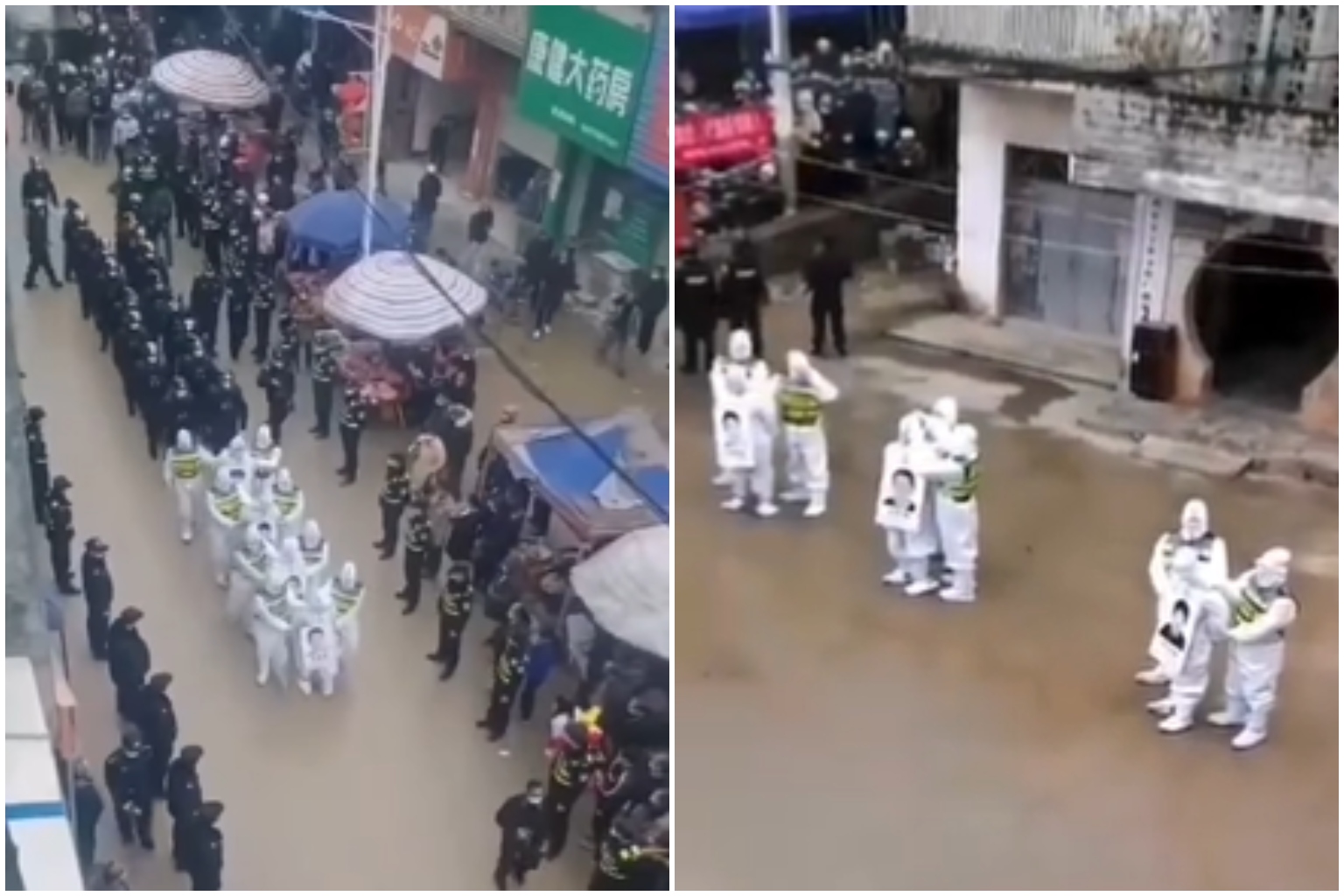They were then seen marching through the streets in their hazmat suits, flanked by police in riot gear.
