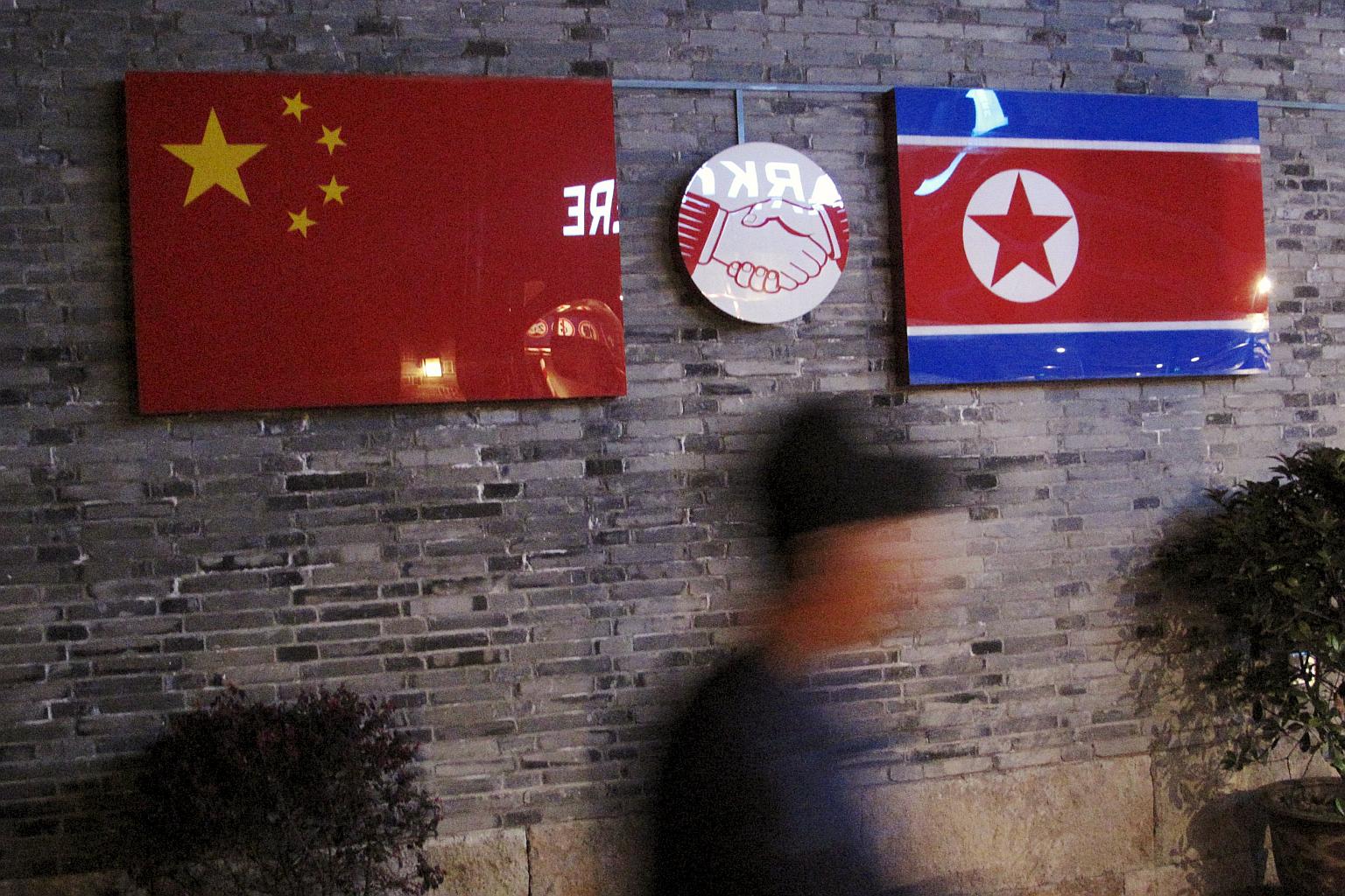 Flags of China and North Korea are seen outside the closed Ryugyong Korean Restaurant in Ningbo, China, on April 12, 2016.