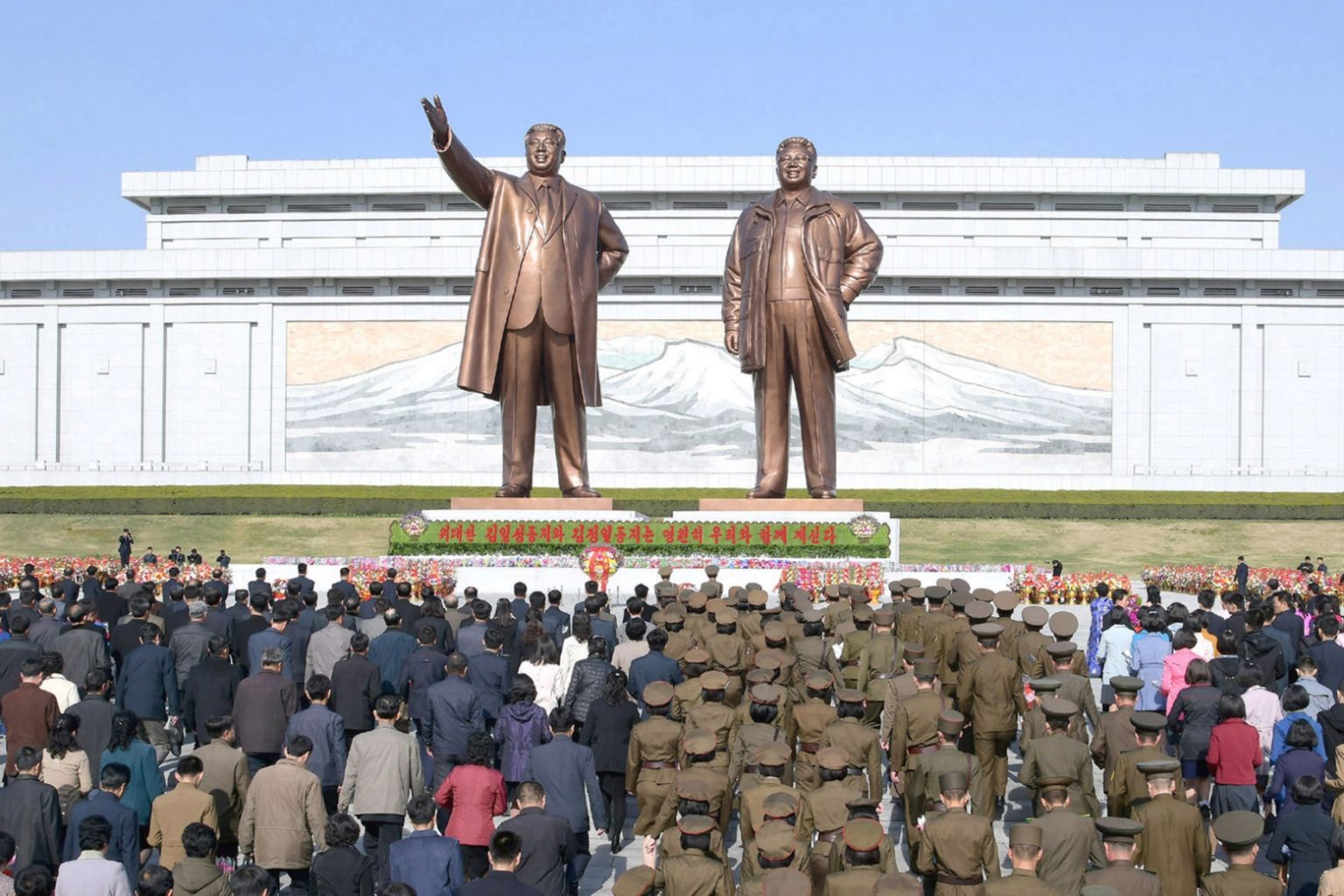 People offering flowers at the statues of late North Korean leaders Kim Il Sung and Kim Jong Il at the Mansu Hill Grand Monument in Pyongyang, on April 15, 2019.