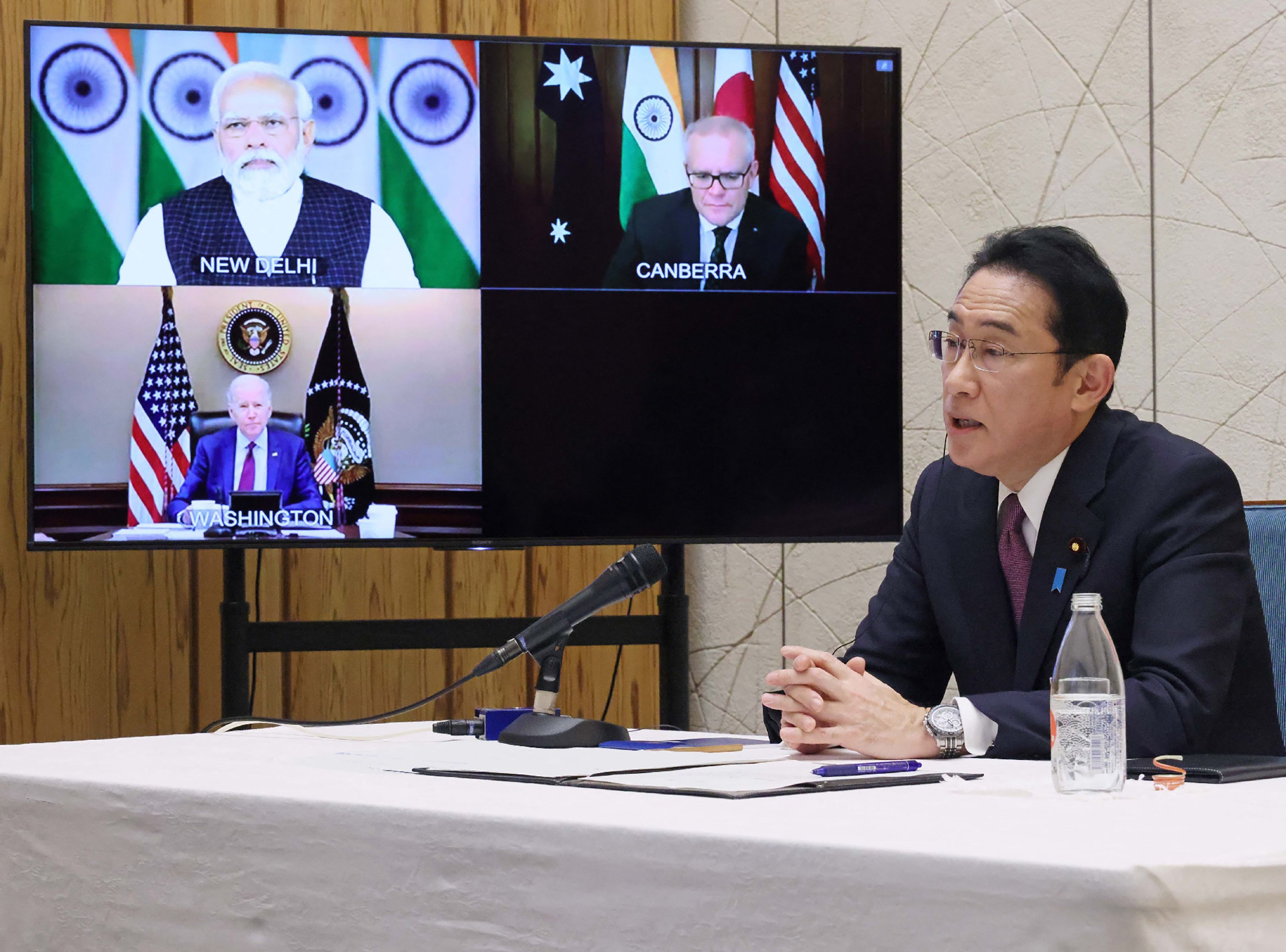 Japanese Prime Minister Fumio Kishida attends the Quadrilateral Security Dialogue, with (on screen) India's Prime Minister Narendra Modi, US President Joe Biden and Australia's Prime Minister Scott Morrison.