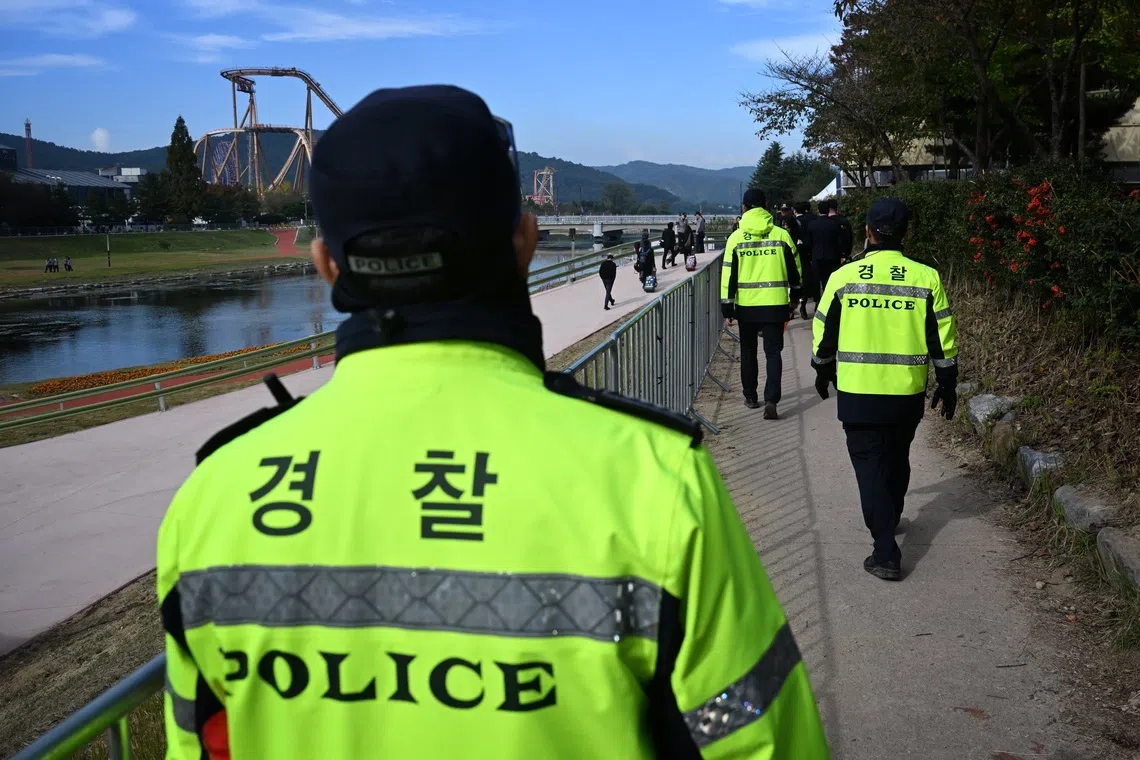 Police officers near the Sona Calm hotel in Gyeongju, South Korea, on Oct 31.