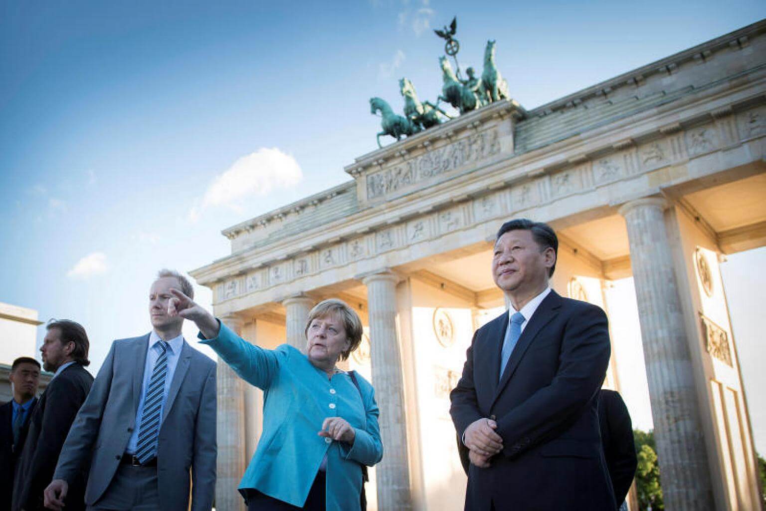 German Chancellor Angela Merkel and Chinese President Xi Jinping in front of the Brandenburg Gate in Berlin, on July 4, 2017.