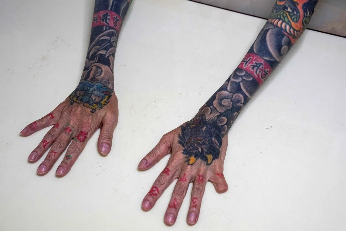 Ms Mako Nishimura showing her forearms heavily inked with dragon and tiger tattoos and a missing fingertip, that she had cut off as part of the yakuza’s ritualistic self-punishment for blunders.