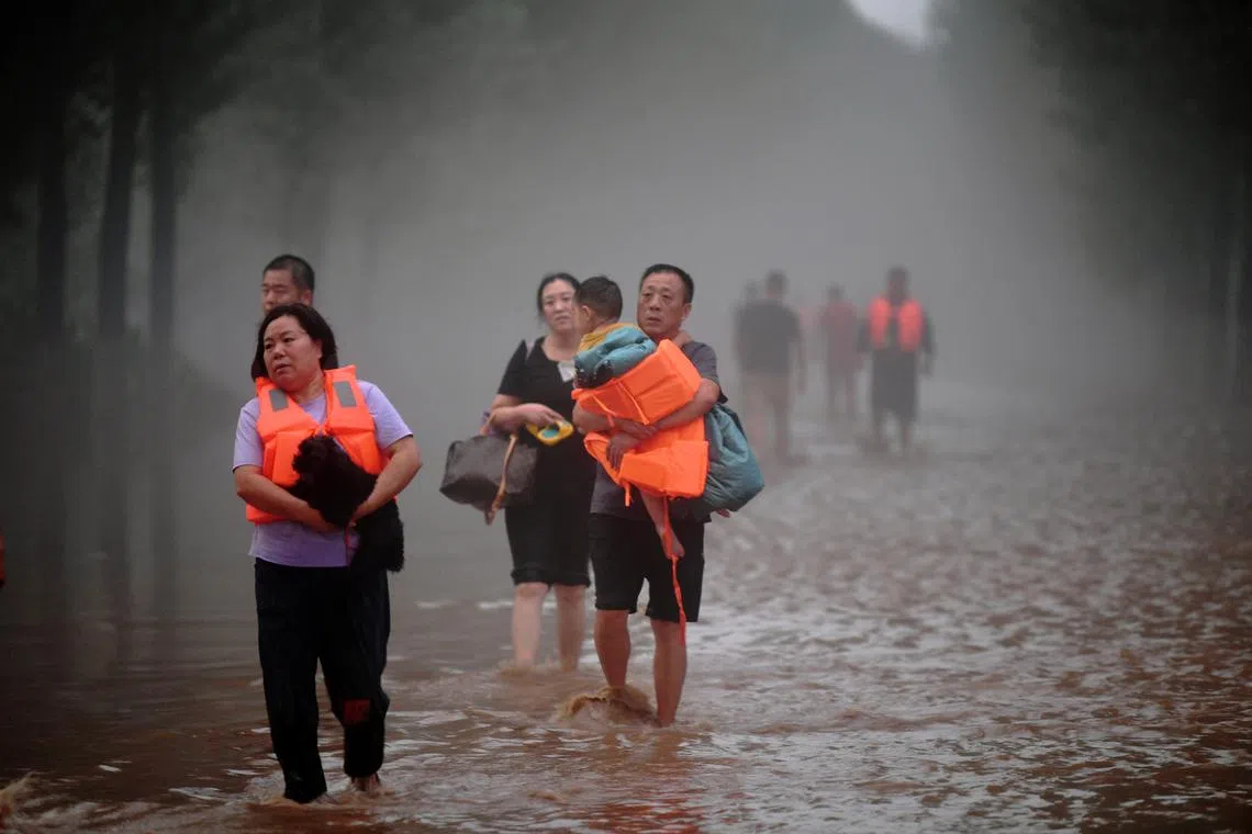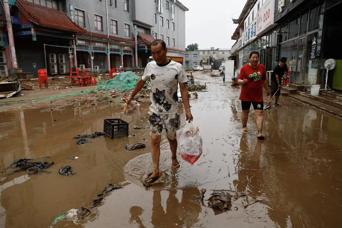 Residents wading through flood waters following heavy rainfall in Zhuozhou, Hebei province, on Aug 1.
