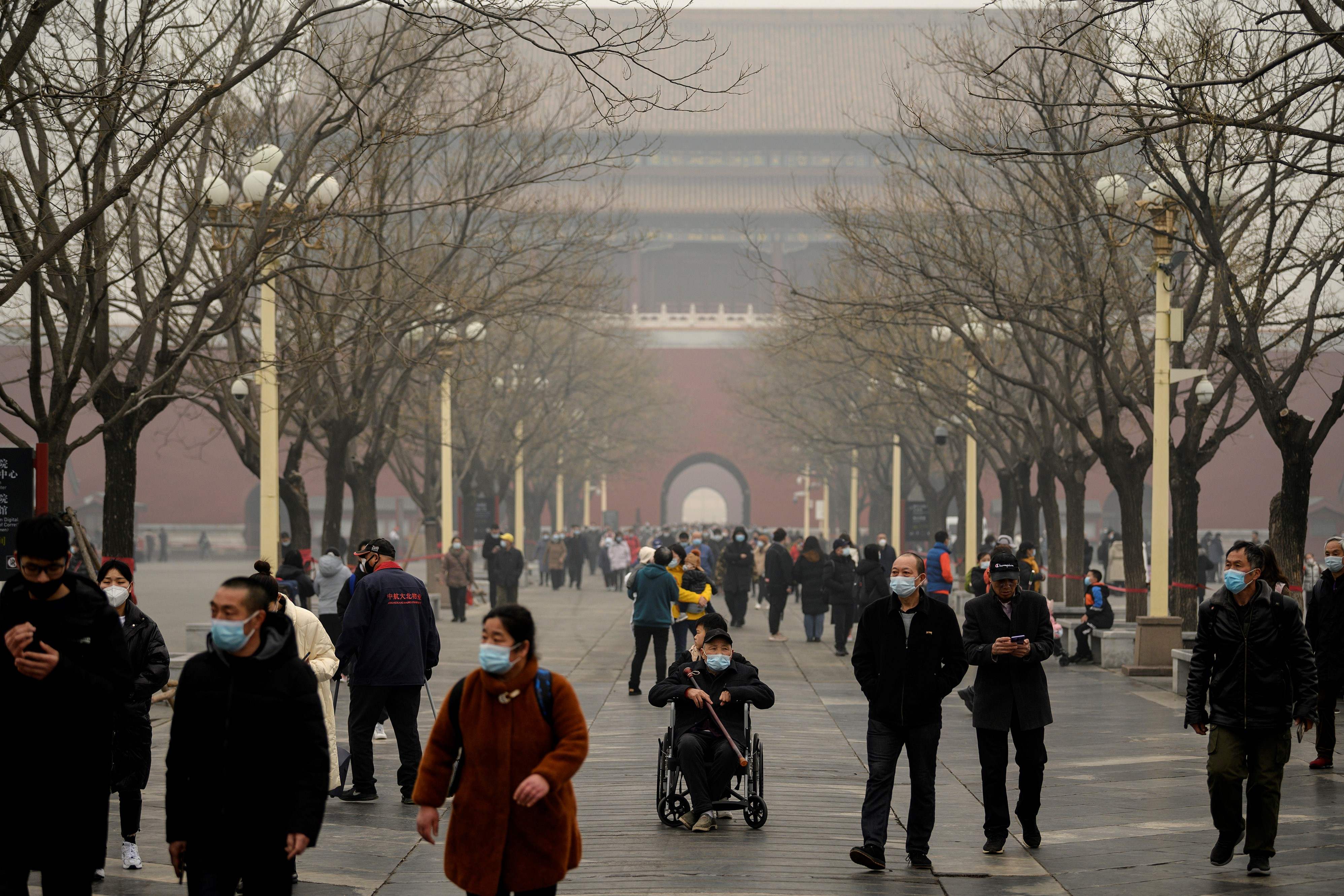 People arrive at the entrance to the Forbidden City in Beijing on Feb 13, 2021.