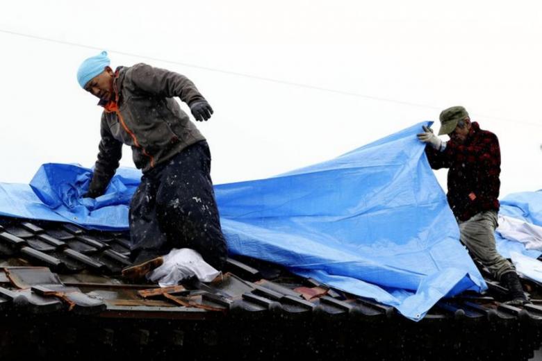 TOKYO (THE JAPAN NEWS/ASIA NEWS NETWORK) - Residents affected by Wednesday's powerful earthquake in Miyagi and Fukushima prefectures had rain and snow to contend with on Friday (March 18) morning, with some locals taking steps to cover the quake-damaged roofs of their homes.
