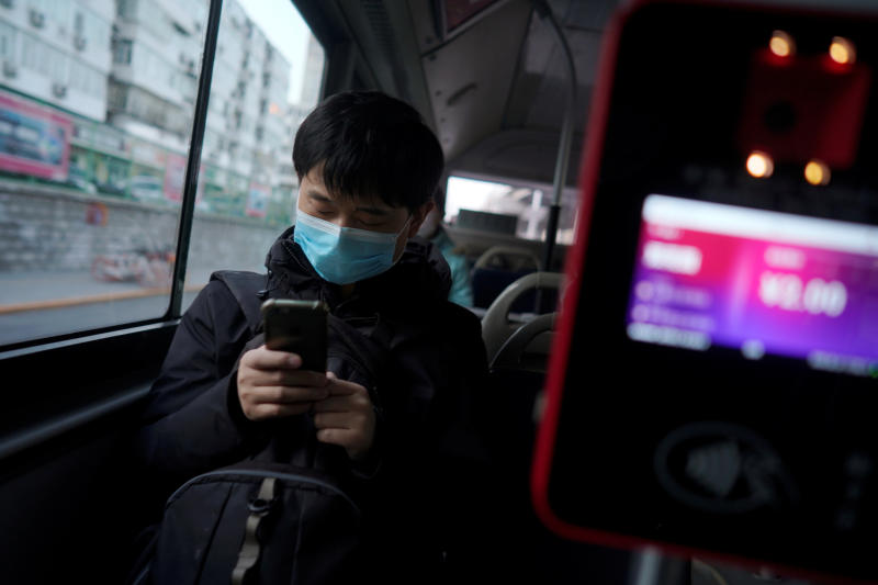 A bus passenger checks his mobile phone in Beijing on Feb 21, 2020.