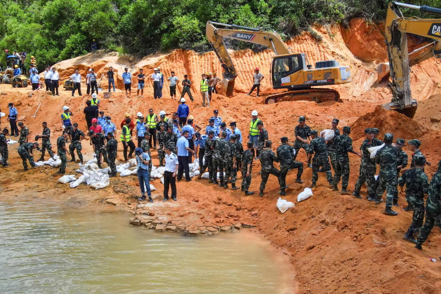Paramilitary police officers working on a flooded tunnel after 14 workers were trapped in Zhuhai, in China's southern Guangdong province on July 15, 2021.