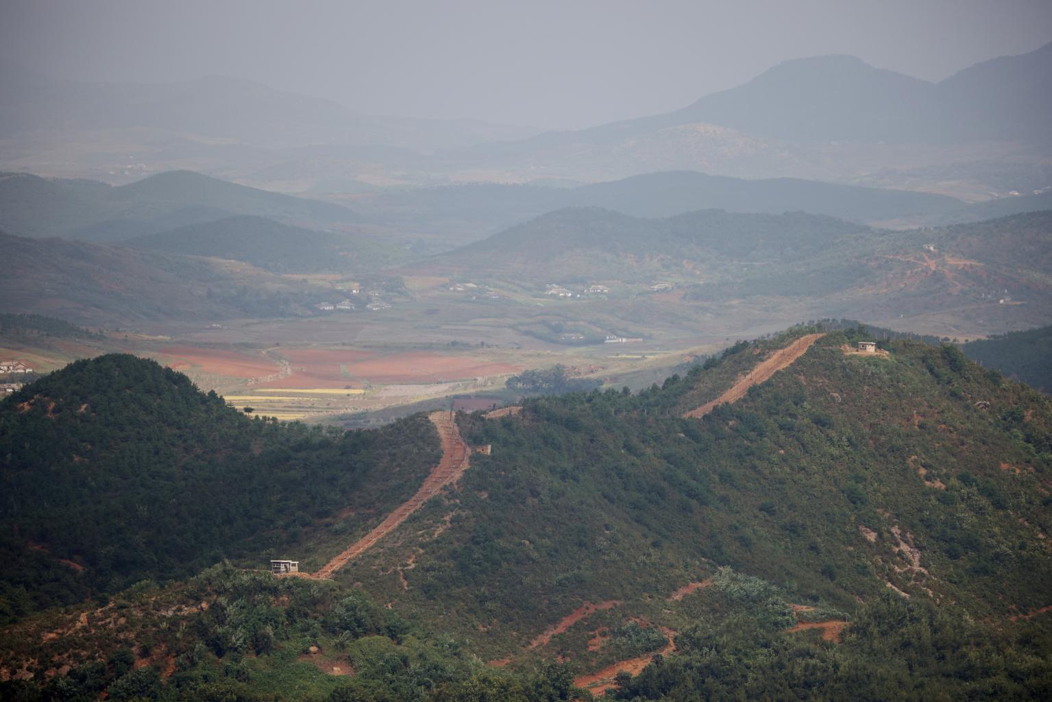North Korean guard posts as seen from the top of the Aegibong Peak observatory in the Demilitarised Zone separating the two Koreas.