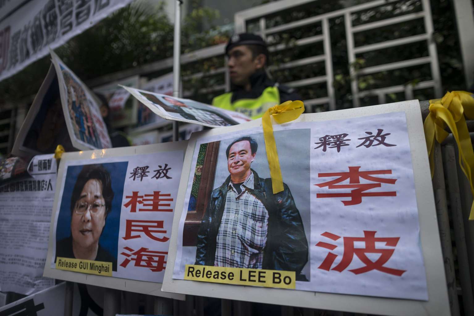 Photographs of the missing bookstore shareholders Gui Minhai (left) and Lee Bo outside the China Liaison Office during a protest in Hong Kong.