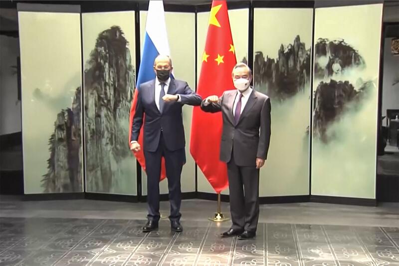 Russian Foreign Minister Sergei Lavrov (left) meets his Chinese counterpart Wang Yi in Huangshan, on March 30, 2022.