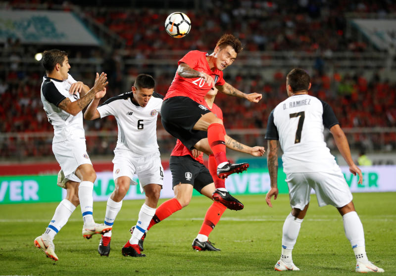 South Korean defender Jang Hyun-soo tussling for the ball during a friendly match against Costa Rica on Sept 7, 2018.