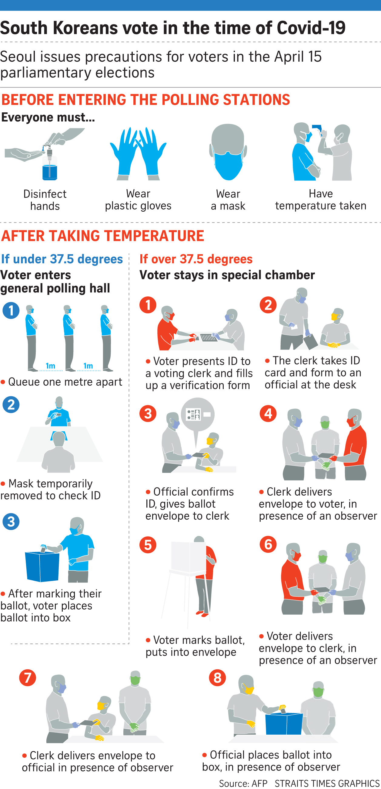 Corporate account manager Aidan Lee, 39, left home alone to vote at 7am, as he wanted to avoid crowds and the risk of infection. Armed with a face mask and hand sanitiser, he cast his vote at an elementary school in the Mapo district in western Seoul.