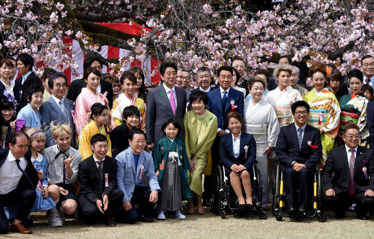 In a photo taken on April 15, 2017, Japan's PM Shinzo Abe and his wife Akie pose with entertainers and athletes during the cherry blossom viewing party hosted by the prime minister in Tokyo.