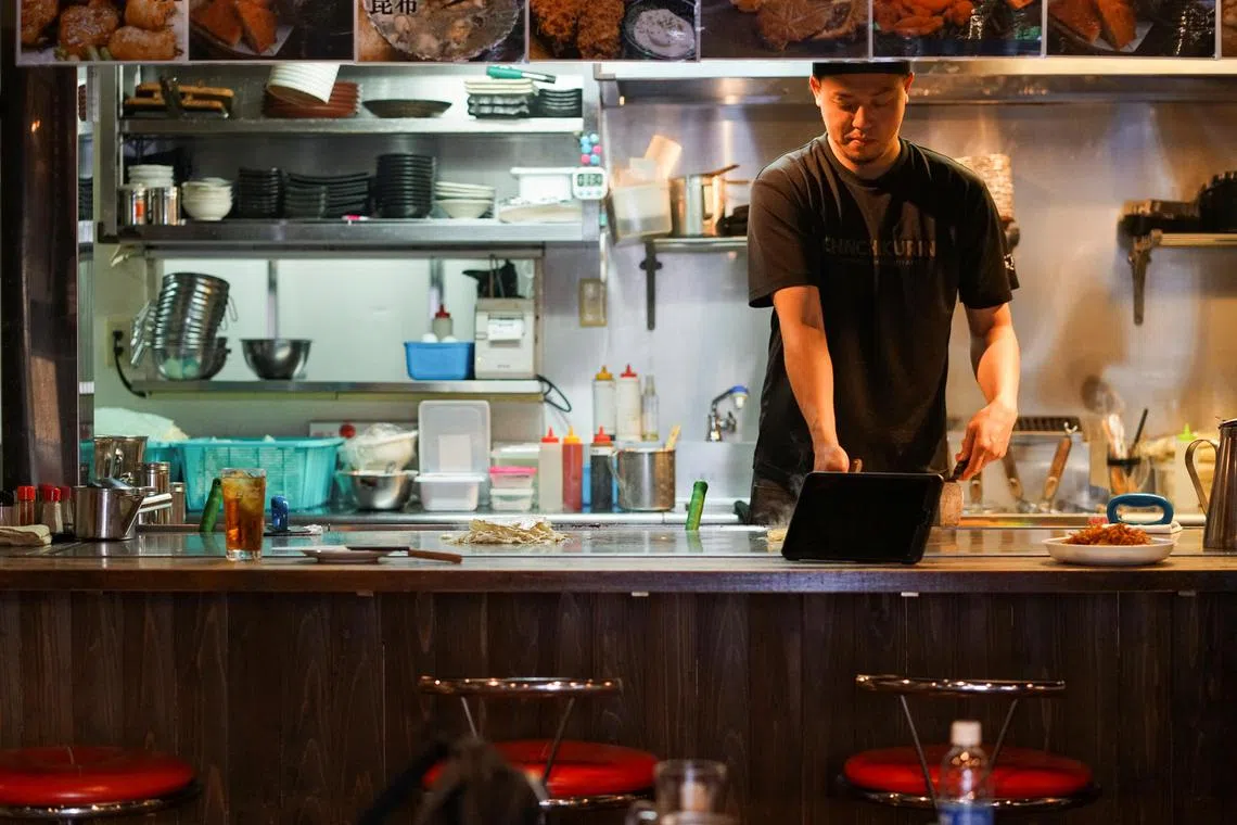 Mr Atsuki Kitaura, manager at okonomiyaki specialty chain Chinchikurin restaurant, prepares an okonomiyaki.