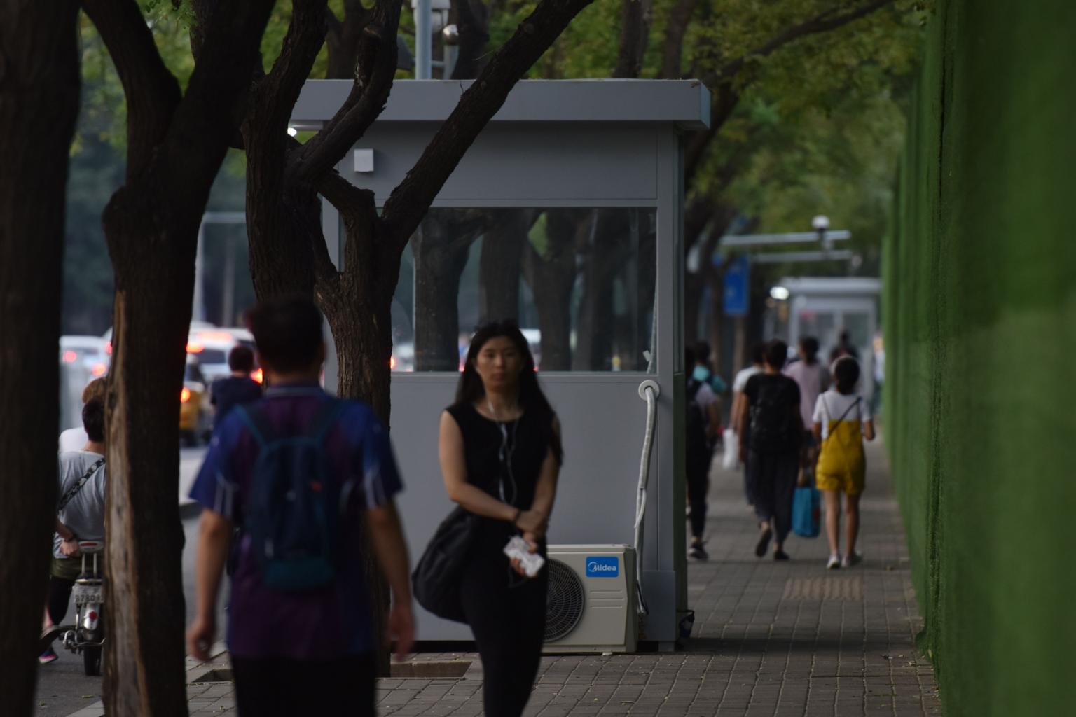 People walking past a newly installed guard post outside the Workers' Stadium in Beijing, on Sept 5, 2019.
