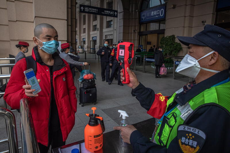 A man shows his health code to security at the entrance of Hankou railway station in Wuhan, on April 8, 2020.