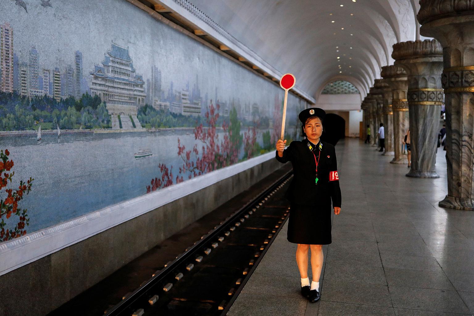 A railway worker gives a signal as the train leaves a train station in Pyongyang, North Korea.