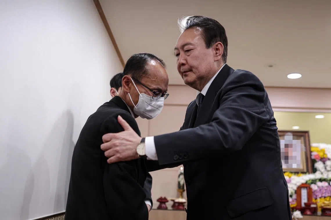 South Korean President Yoon Suk-yeol (right) consoling a family member of one of the victims of the Itaewon crowd crush in Bucheon, South Korea, on Nov 2, 2022.