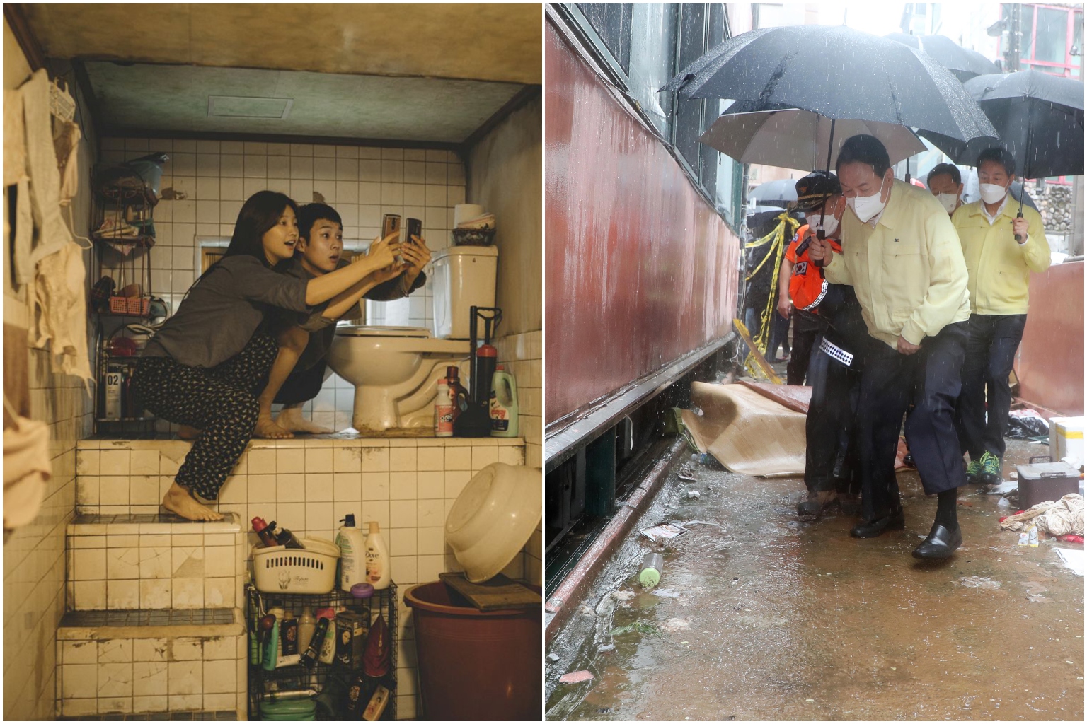 A still from the film Parasite (left) showing a basement home. South Korean President Yoon Suk-yeol (right) inspects a submerged semi-basement home in Seoul, on Aug 9, 2022.
