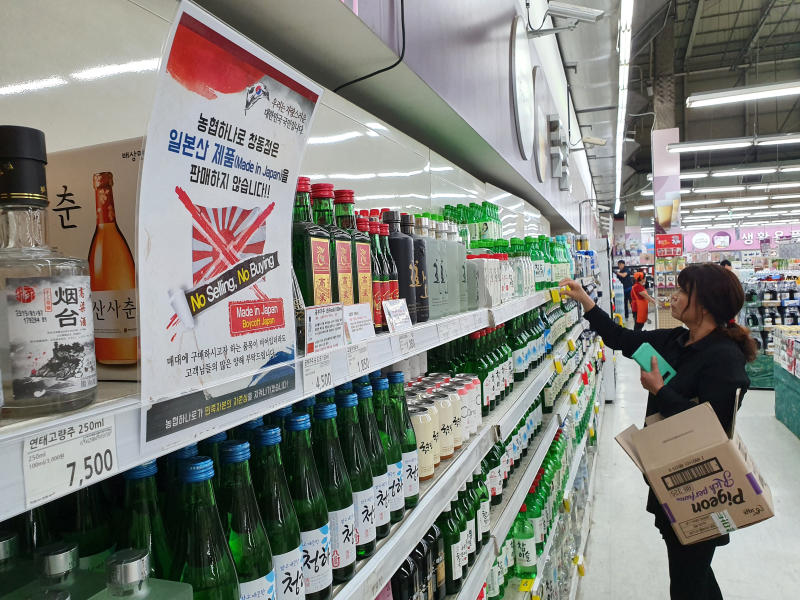 A banner campaigning for boycott of Japanese products at a market in Seoul on July 12, 2019. The banner reads "We don't sell Japanese products."