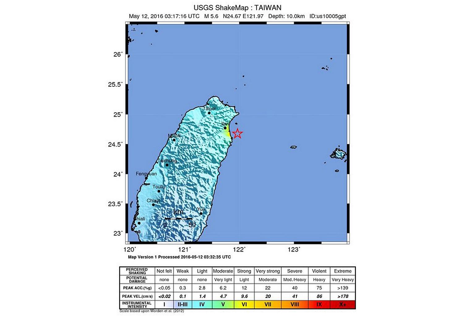 A shakemap released by the USGS shows the location of a 5.6 magnitude earthquake striking some 14km east-southeast of Su'ao Township in Yilan County, off the coast of northeast Taiwan on May 12, 2016.