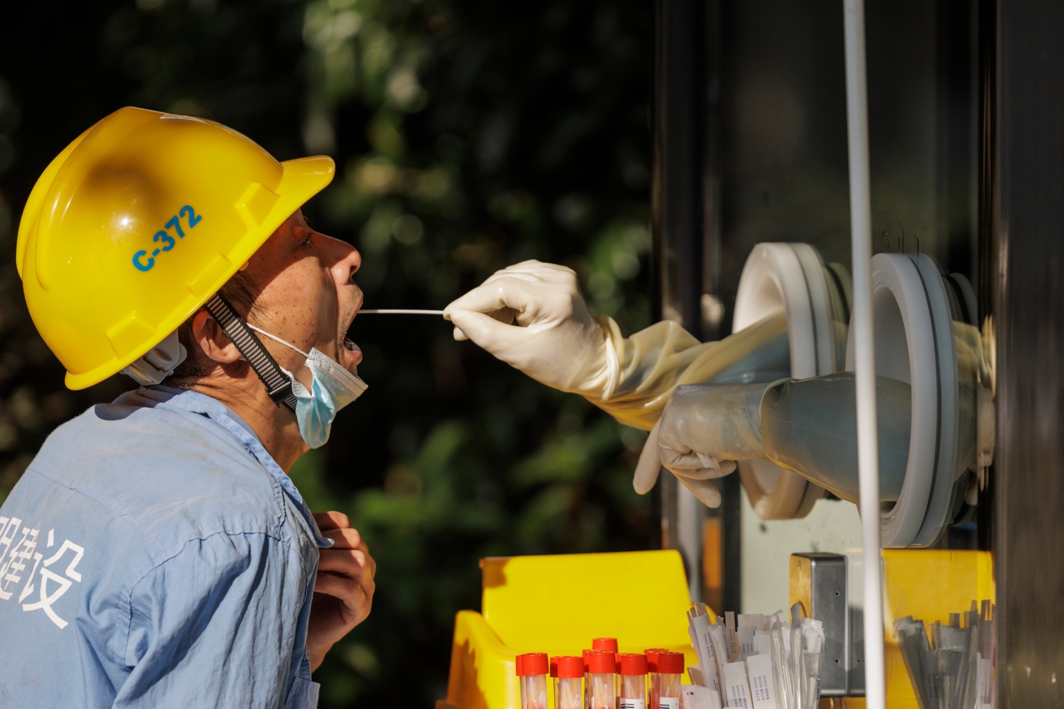 A worker takes a Covid-19 PCR test in a testing booth on the street, in Shanghai, on July 8, 2022.