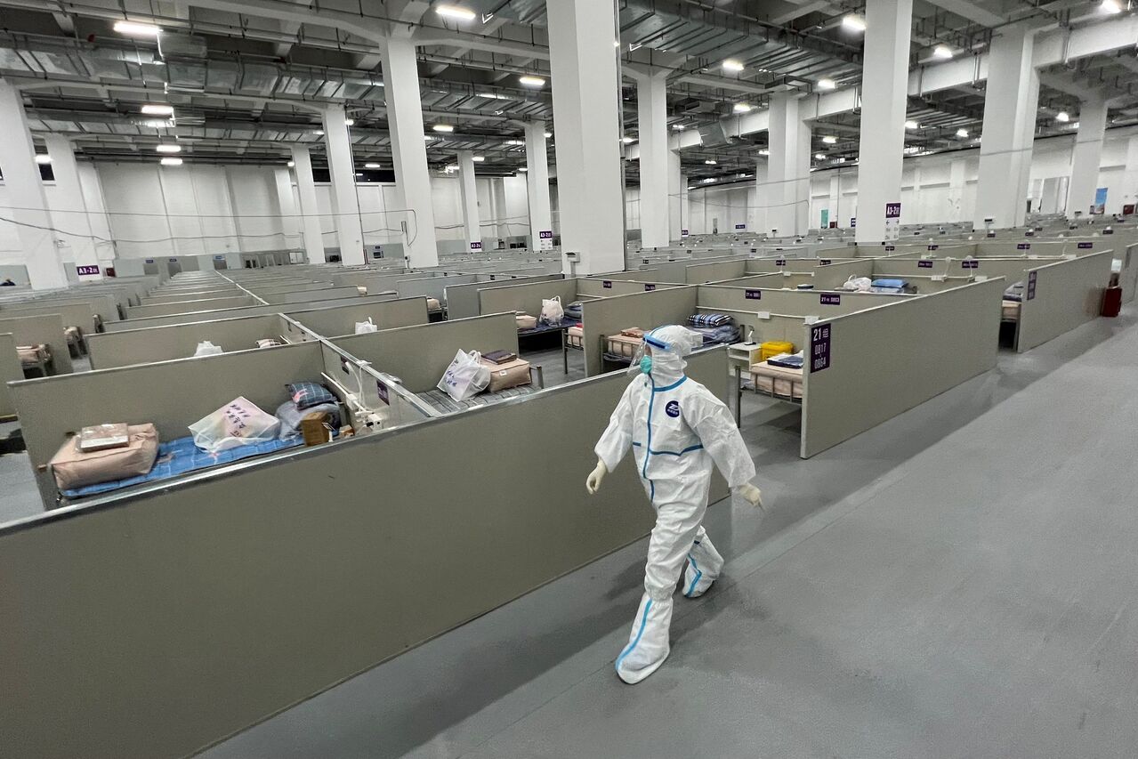 A staff member inside a makeshift hospital that will be used for Covid-19 patients in Shanghai.