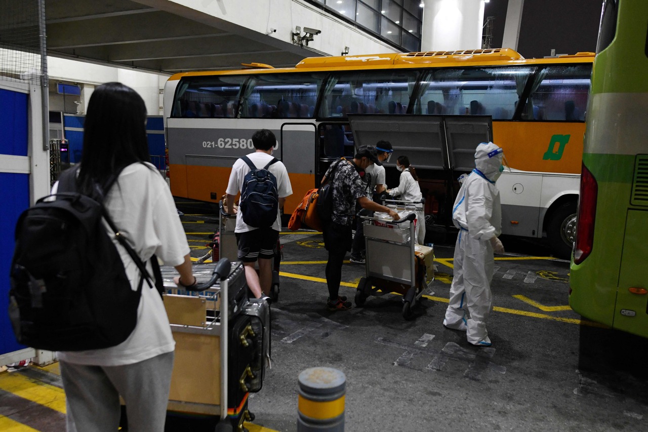 Health workers helping travellers at Pudong airport in Shanghai as they prepare to board buses to be taken to quarantine hotels on Aug 13, 2021.