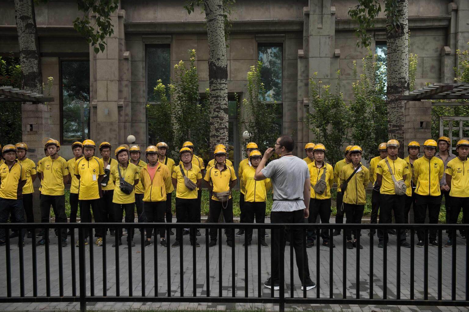 Food delivery workers (in yellow) get their morning briefing on a street in Beijing, on Aug 15, 2017.