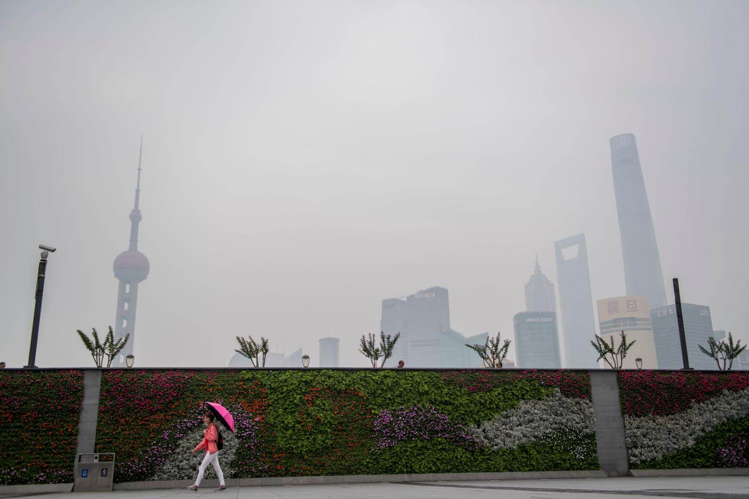 File photo showing a woman walking with an umbrella on a hazy day along the Huangpu River against the skyline of the Lujiazui Financial District in Shanghai, on May 29, 2018.
