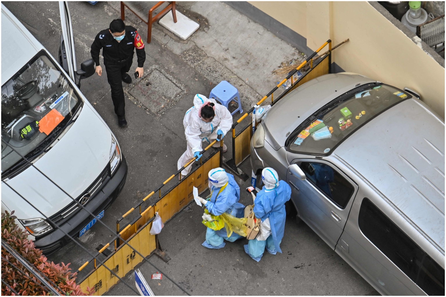 Health workers at a check point during a lockdown in the Jing'an district in Shanghai on April 8, 2022.