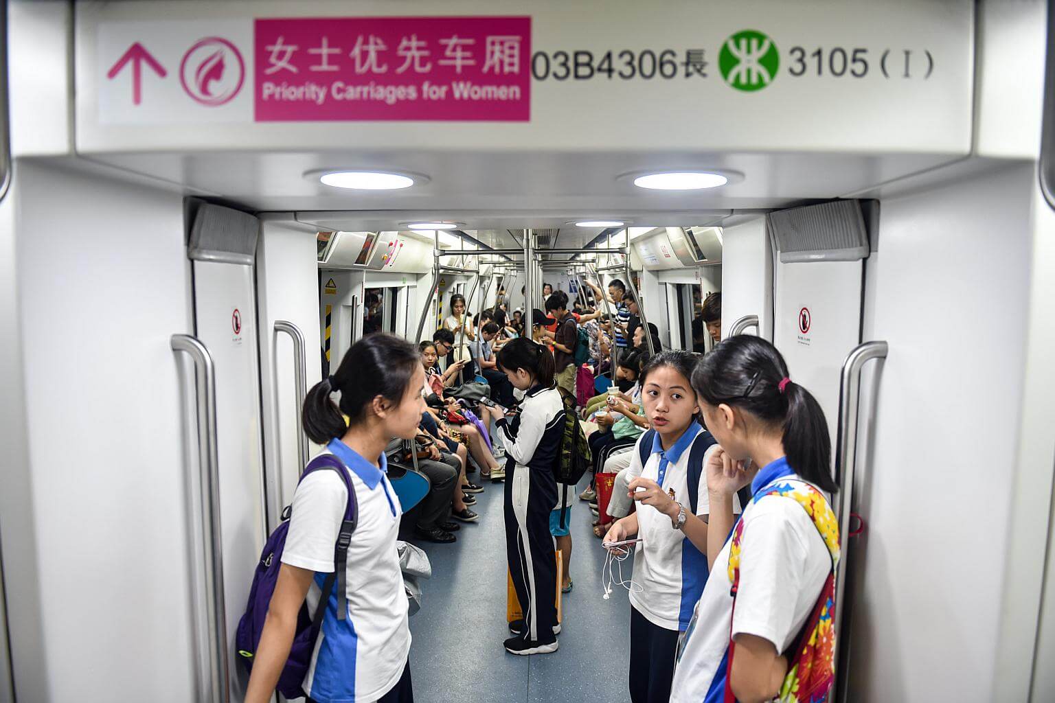 Female students seen riding in a ladies first carriage on the Shenzhen Metro.