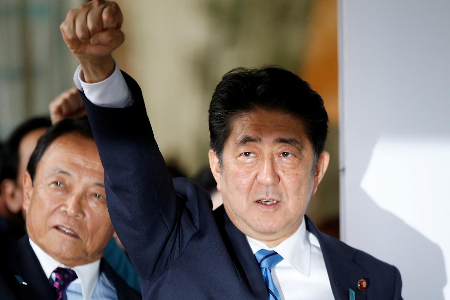 Japan's Prime Minister Shinzo Abe and his party's lawmakers, including Taro Aso (left), at their party headquarters in Tokyo, Japan on Sept 28, 2017.