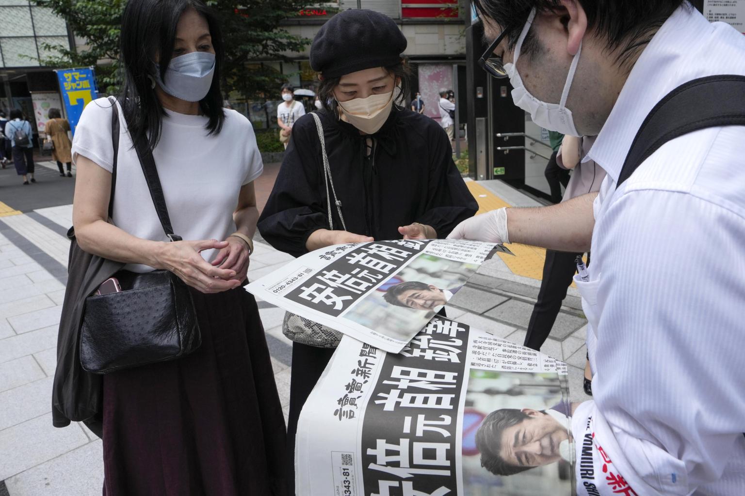 People view newspapers reporting former Japanese Prime Minister Shinzo Abe being shot, in Tokyo, on July 8, 2022.