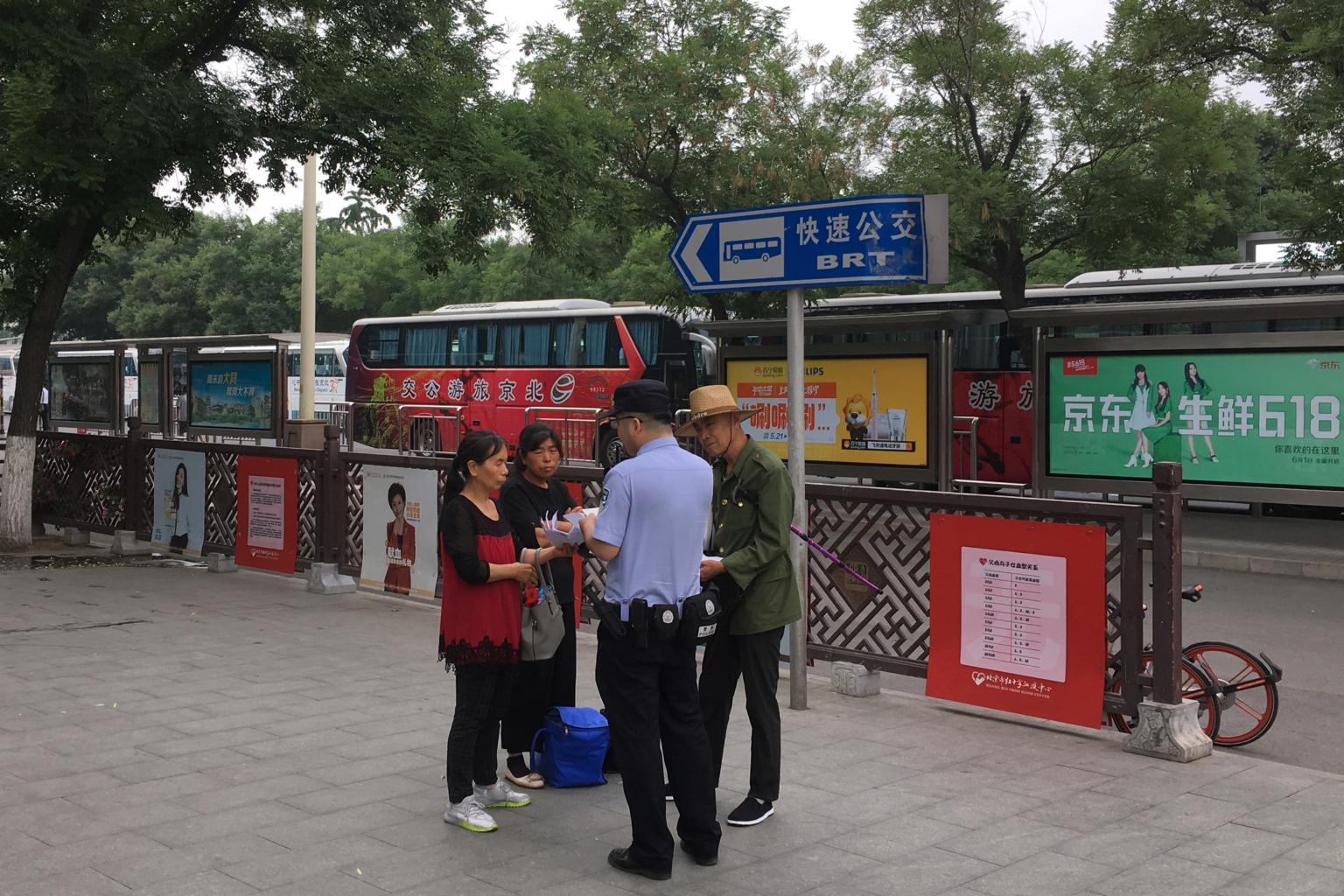 A police officer stops petitioners at the southern end of Tiananmen Square in Beijing, China on June 4, 2019.