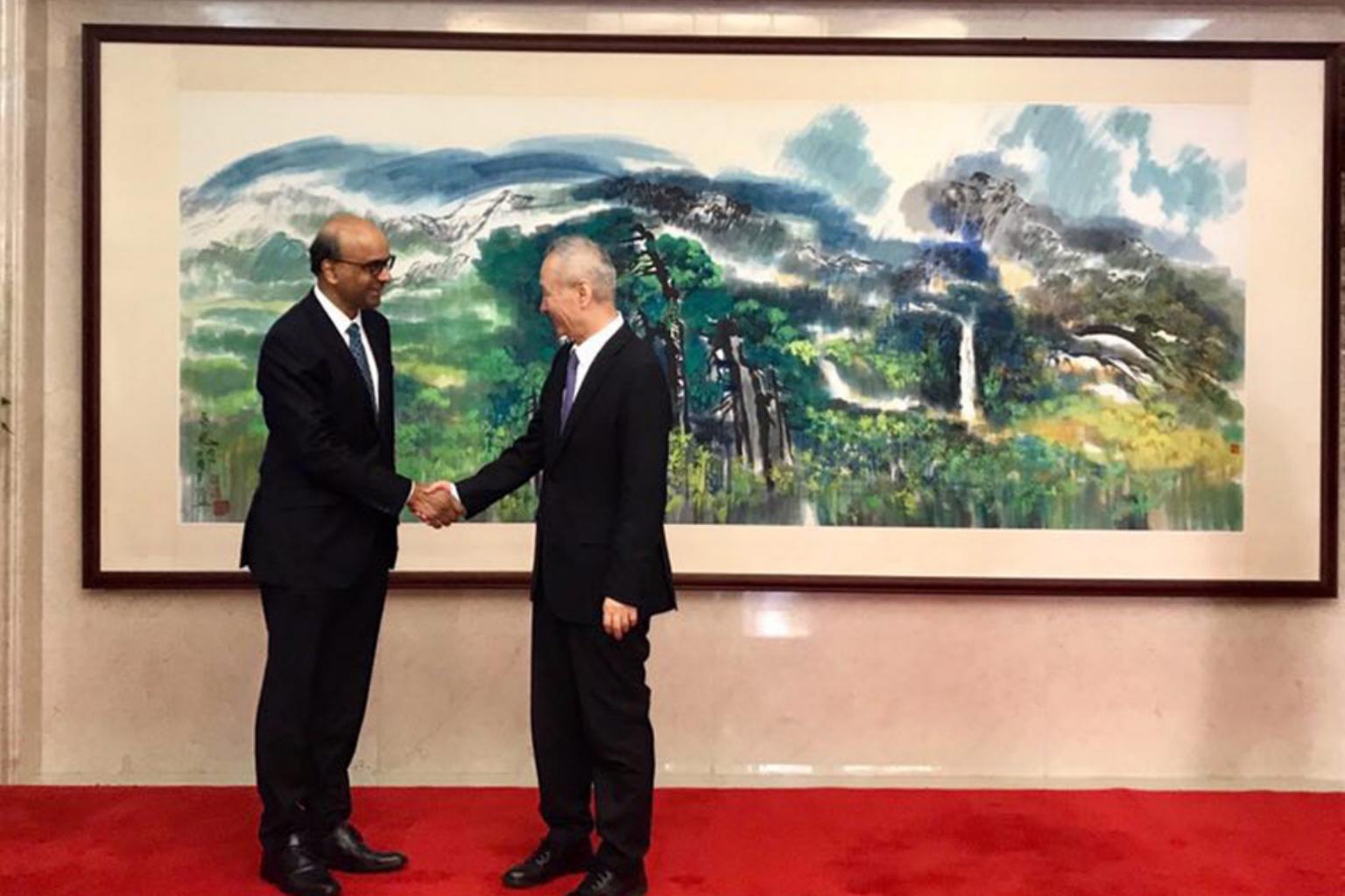 Deputy Prime Minister Tharman Shanmugaratnam and Chinese Vice Premier Liu He agreed to deepen bilateral partnership in the areas of finance, regional infrastructure development, education as well as science and technology.