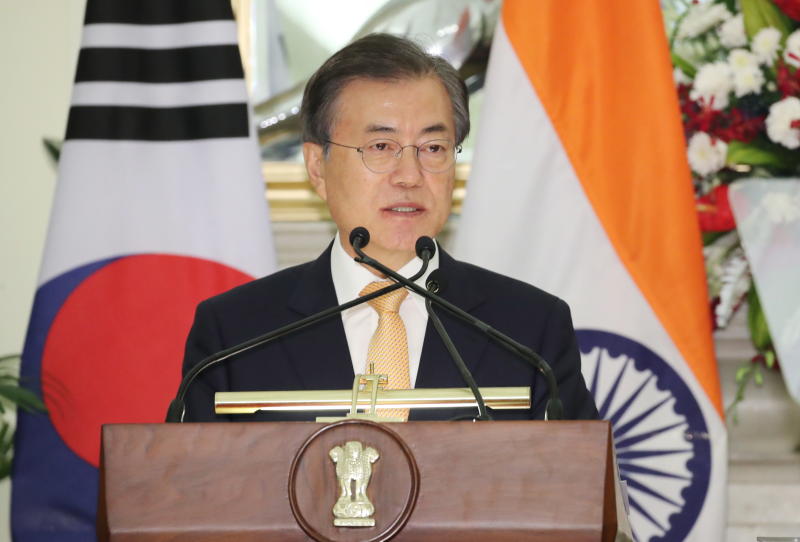 South Korean President Moon Jae-in at a joint press conference with India's Prime Minister Narendra Modi (not pictured) after holding summit talks at Hyderabad House in New Delhi, India, on July 10, 2018.